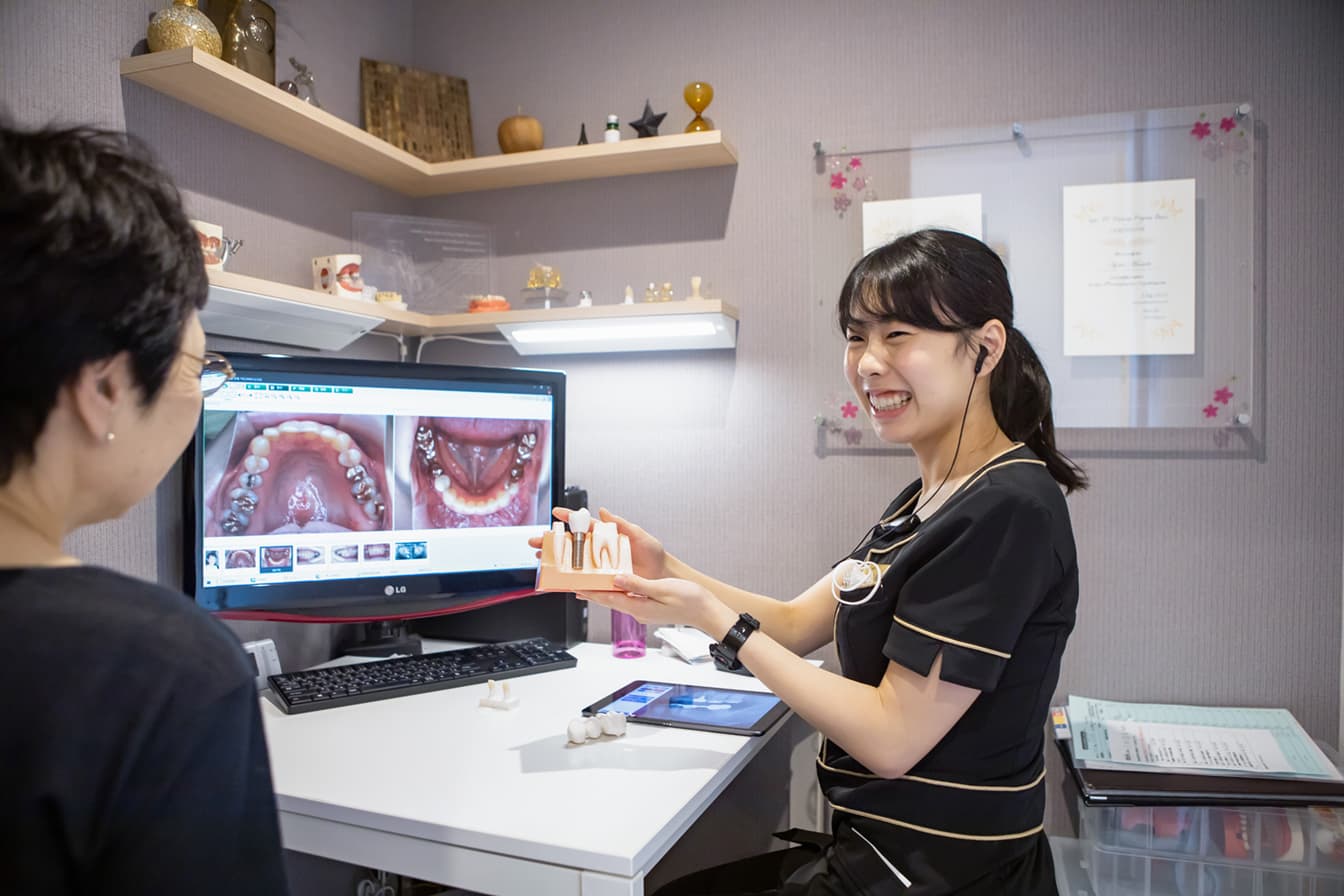 歯に関するお悩みであれば、どんなことでもお気軽にご相談ください。 また当院にご来院いただくのが初めての方の場合、60分のお約束をお取りいただいております。